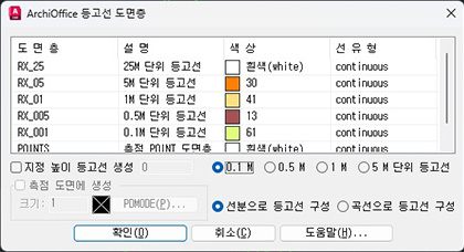 측점 데이타 파일을 이용하여 등고선 작성 시, 측점도 같이 도면에 생성 시킬 수 있습니다.